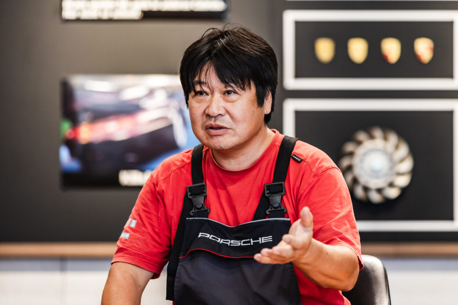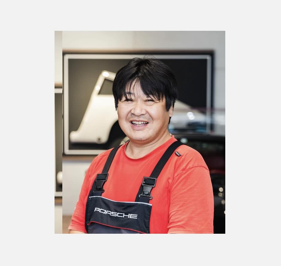 日産プリンスを経て、1990年よりミツワ自動車へ入社。。以降、ポルシェのメカニックを35年にわたり担当。ドイツ本社に招聘され、若手への技術指導を行うほどのスキルを誇る。